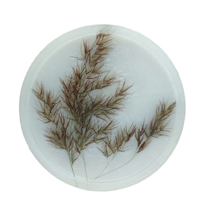 See alus on valminud mittetoksilisest epoksiidvaigust, mille sisse on kapseldatud päris pilliroog — loodus oma algsel kujul, mis ei kordu kunagi identselt. Valge ja puhas põhitoon loob rahuliku fooni, mis laseb materjali orgaanilisel juhusel esile tulla.